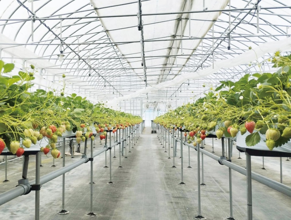 冬春は見た目も美しく濃厚な食味の「よつぼし」、夏秋は輸送性・日持ちも良く爽やかな食味の「夏のしずく」を栽培しています。 自社のスマート農業技術を活用したハウスで、イチゴの生育をコントロールすることで通年栽培を実現しています。